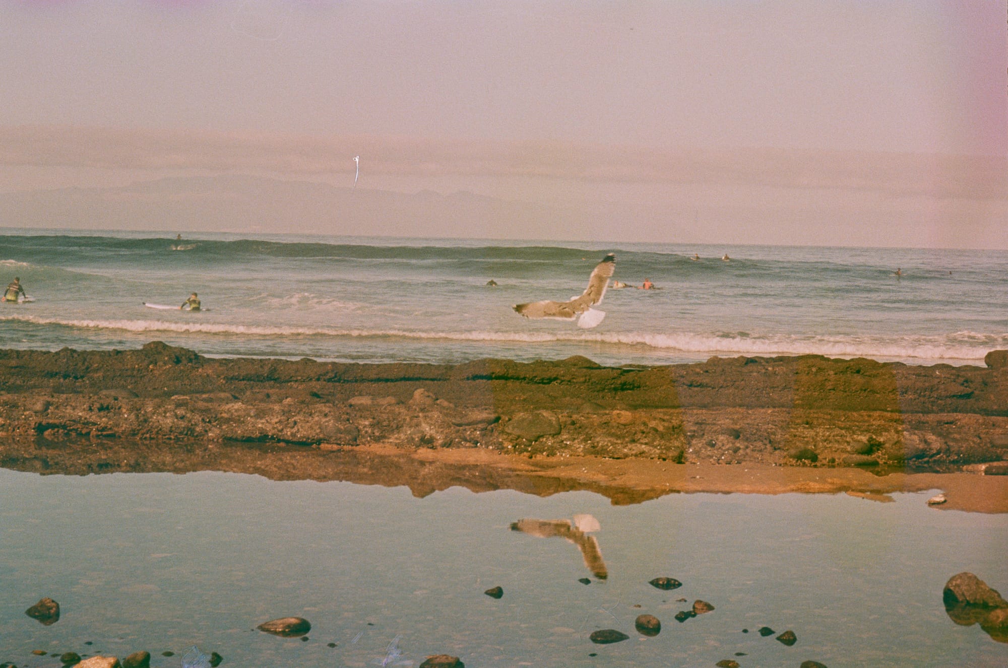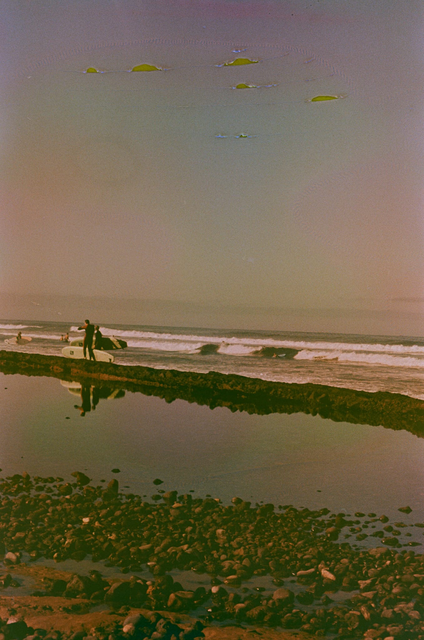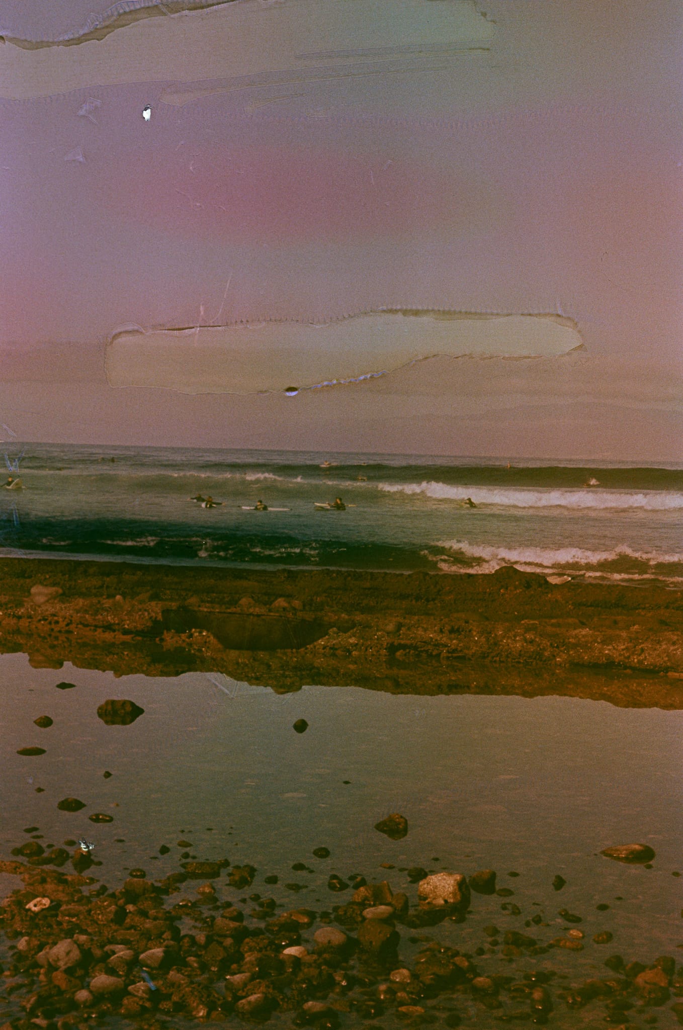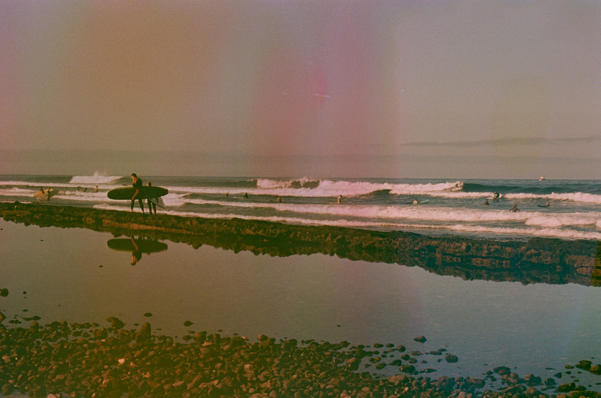 The morning light was beautiful, and I cannot wait to share photos of it once my film negatives return and I scan them in. A wave of contentment washed over me in time with the tide, and as I got closer, I could see dozens of surfers bobbing out at sea, along with some big waves. I picked up the pace, excited to get closer and watch the action.